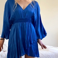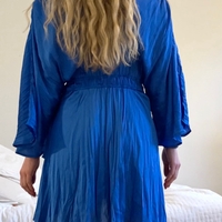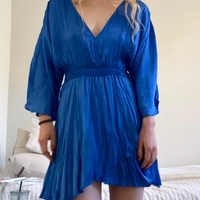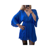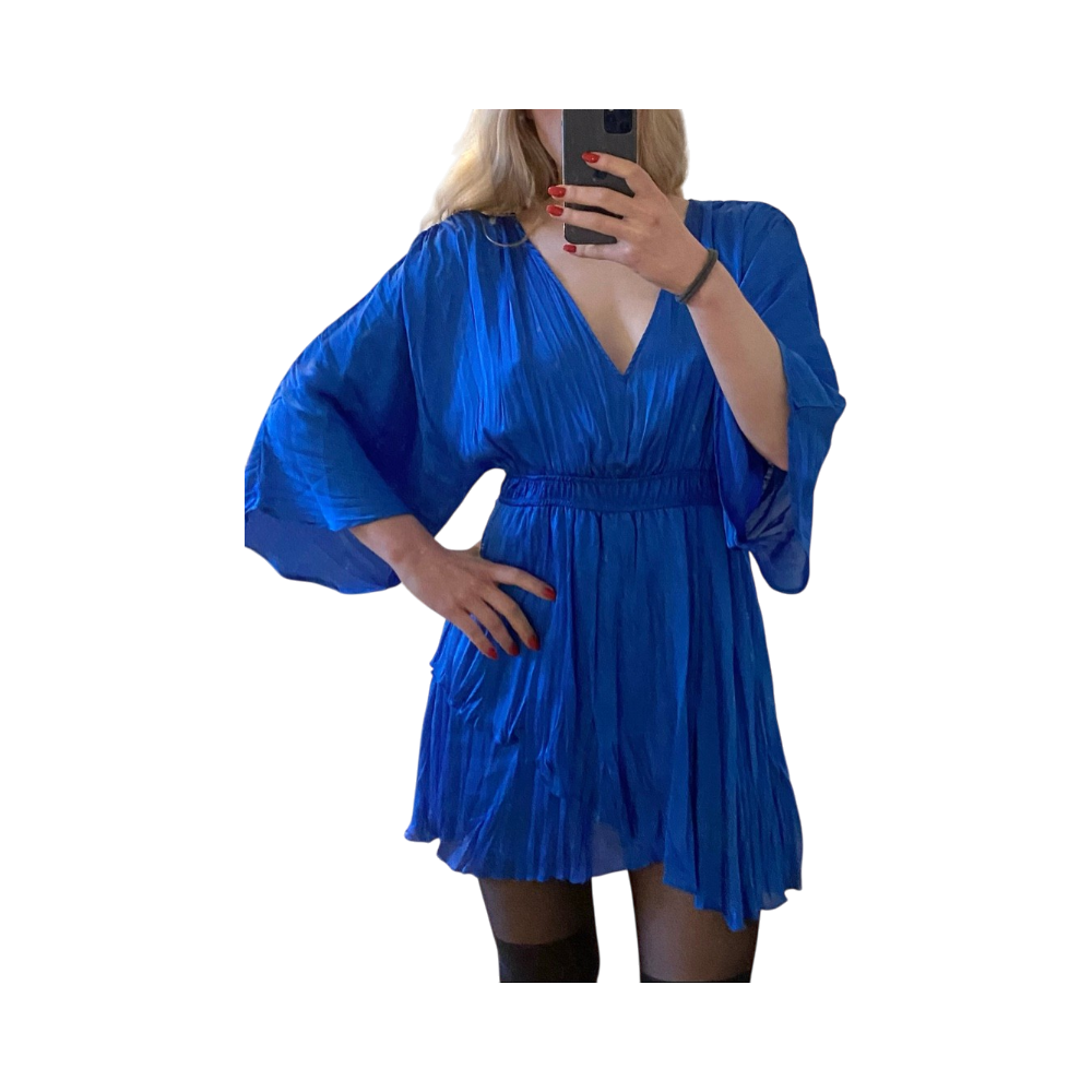 Lyhyt, sininen, pliseerattu V-aukkoinen mekko leveillä hihoilla. Mekossa on shortsit. Käyttämätön.