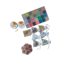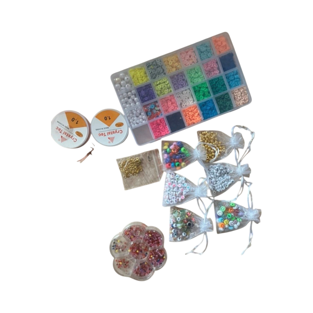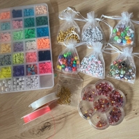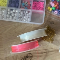 Sekoitus muovi- ja helmiä sekä nyöriä koruiluun.
