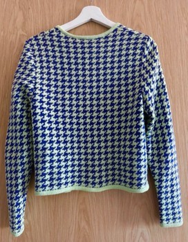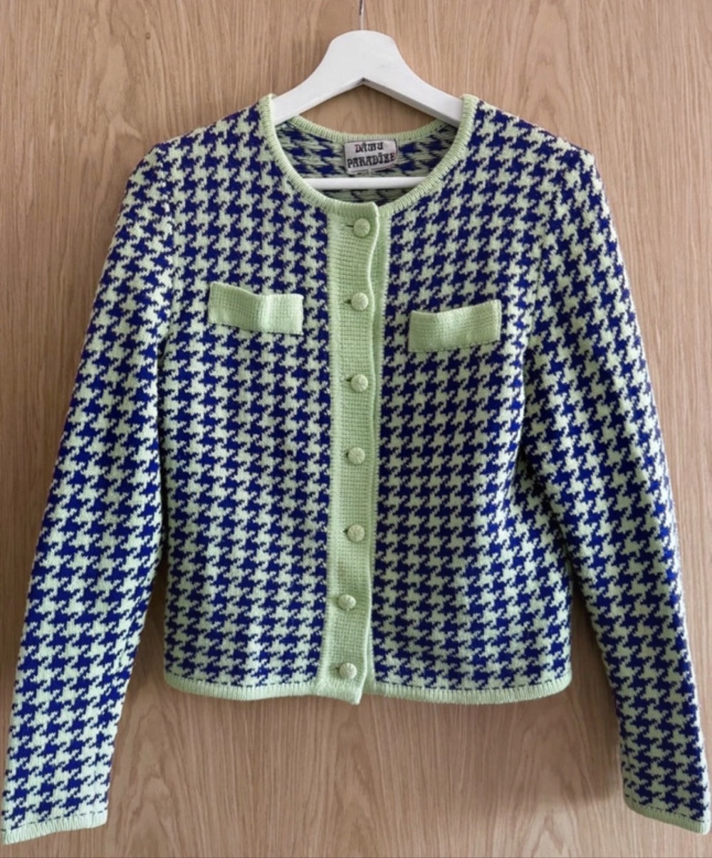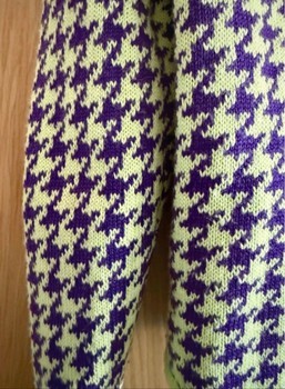 Button-up cardigan with a houndstooth pattern in purple and light green. Features two small chest pockets.