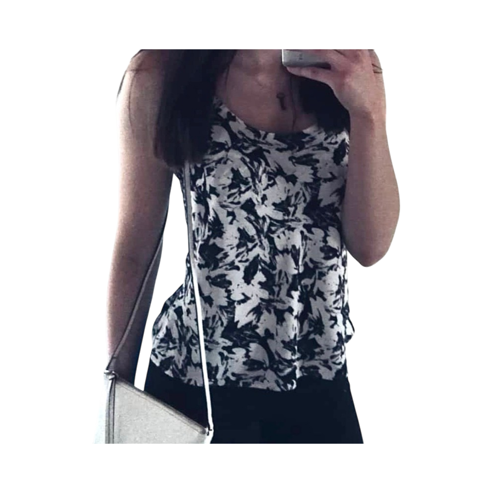 BikBok toppi koossa XS. Valkoinen pohja, tummansininen kukka-/printtikuosi ja ohuet olkaimet ristiin selässä. Erittäin hyvä kunto.