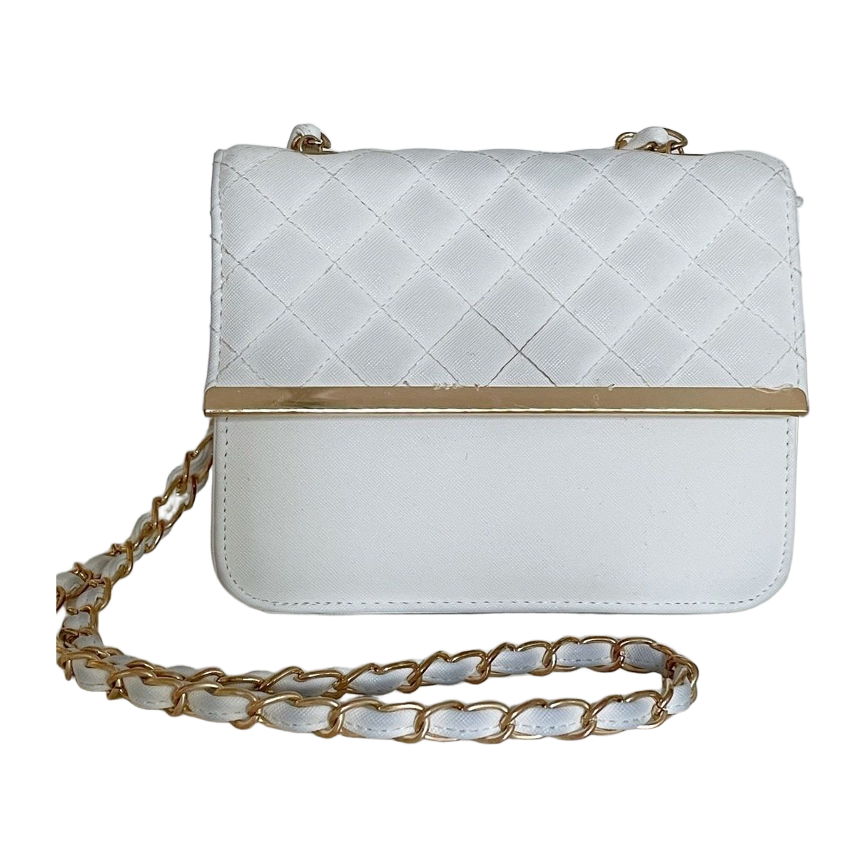 Stylish white shoulder bag with a gold chain strap. Some darker colour has rubbed onto the surface and strap, but otherwise in excellent condition. Comes with an inner zip pocket – perfect for everyday use or parties.
