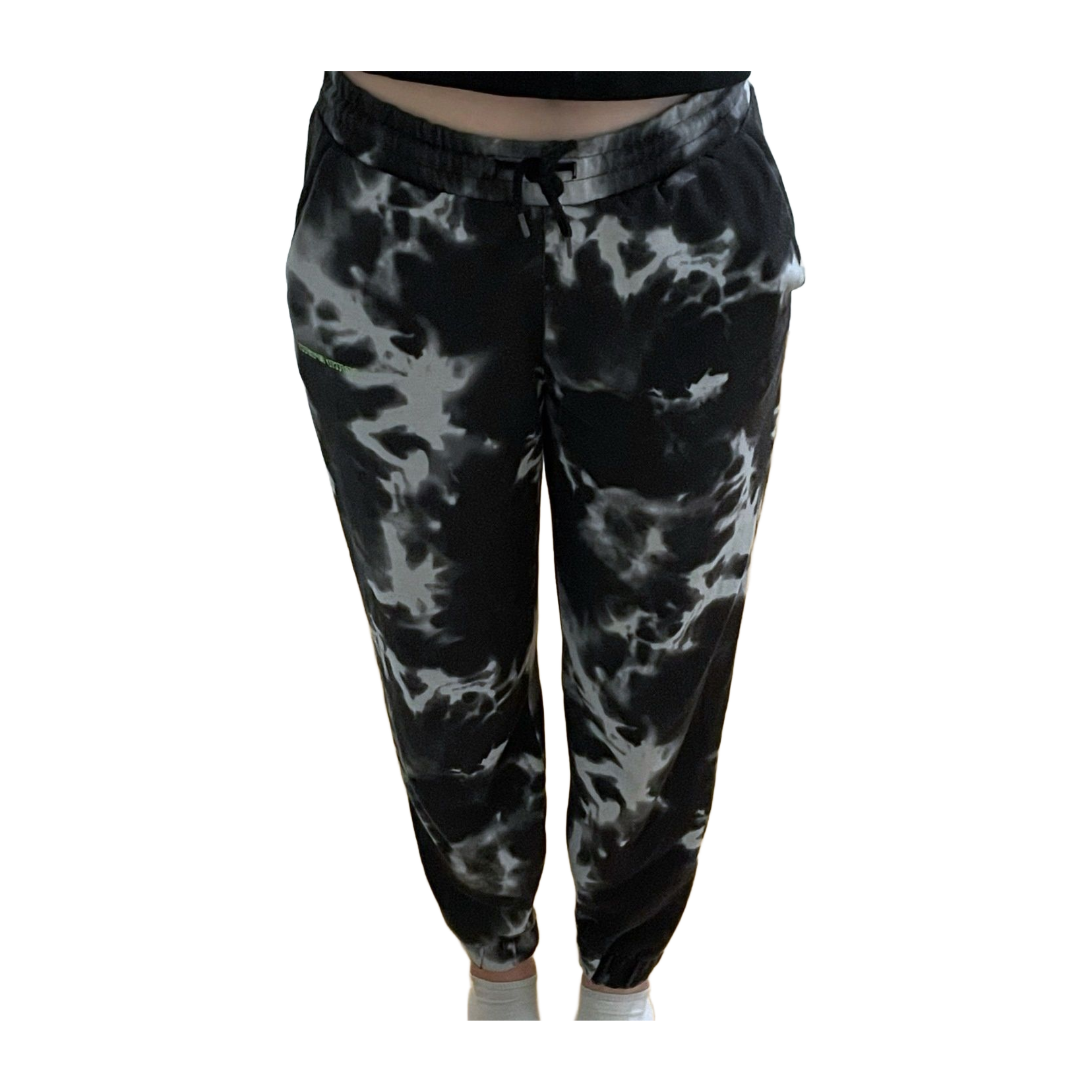 Stylish black and white sweatpants with a bold pattern. Elastic waistband with drawstring and ribbed cuffs at the ankles. Lightweight and comfortable fabric makes them perfect for everyday wear, workouts, or lounging at home. Size XS, but fits also size S thanks to the stretch. Excellent condition.
