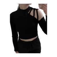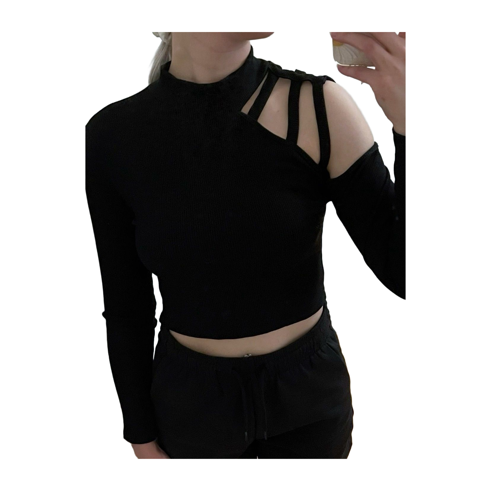 Stylish black crop top with bold cut-out details, featuring a mix of long sleeve and open shoulder design. Size XS/S, excellent condition. Perfect for parties, clubs or nights out – adds edge and confidence to any outfit. Easy to style with jeans, skirts or leather pants.