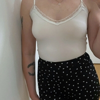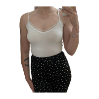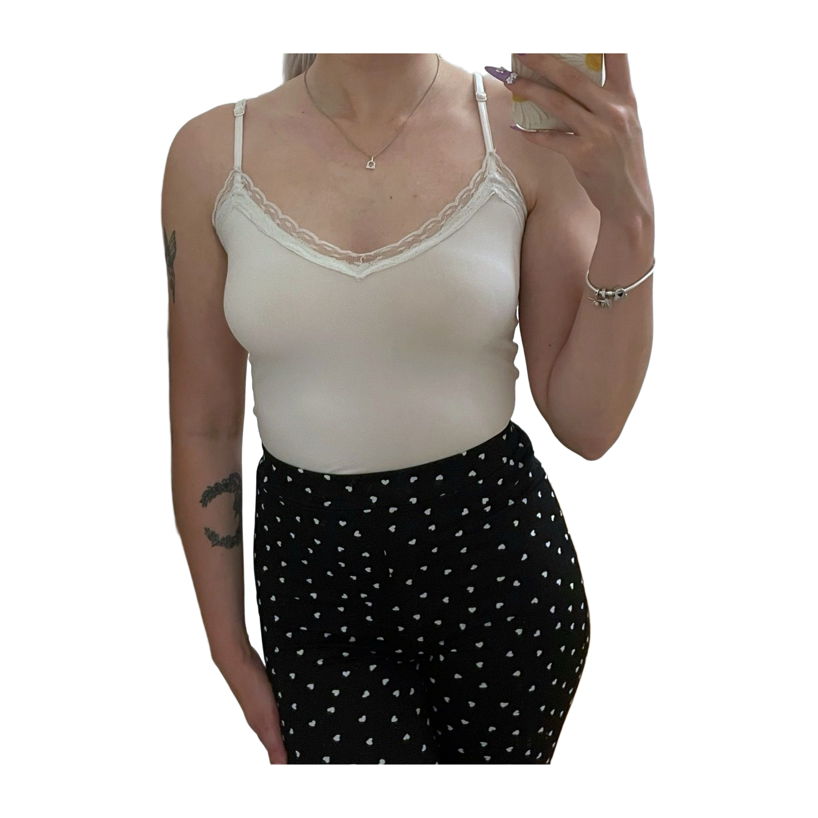 Elegant and simple white top with thin straps and lace trim along the neckline. Perfect for everyday wear, parties, or layering. Size XS, stretchy material for a comfortable fit. Excellent condition, no stains or visible wear.