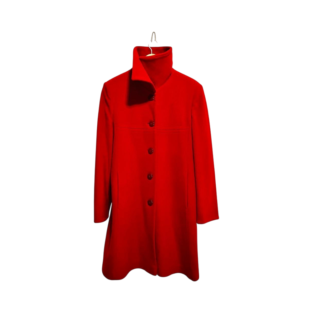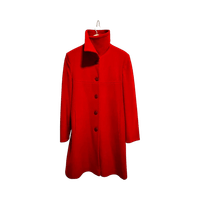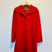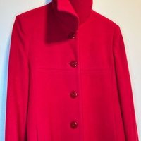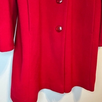Punainen lämmin villakangastakki (väri näkyy parhaiten viimeisessä kuvassa!), laadukkaasta ja paksusta villakankaasta valmistettu vuosituhannen vaihteessa. Erinomaisessa kunnossa, käytetty muutaman kerran teatterissa tai juhlissa.