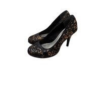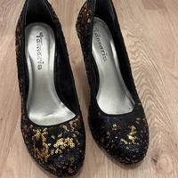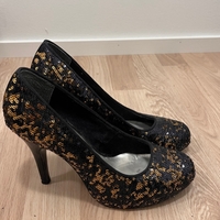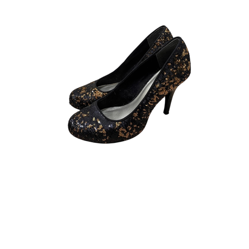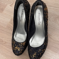 Korolliset naisten juhlakengät, musta ja kultainen paljetti.
