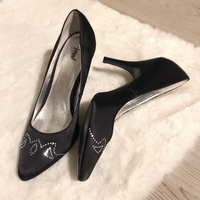 Haloselta yli vuosi sitten ostetut täysin käyttämättömät mustat juhlakengät hopeisilla yksityiskohdilla, korkoa noin 8cm!🌸 ovh 55€