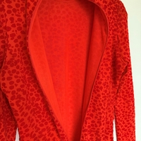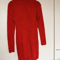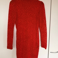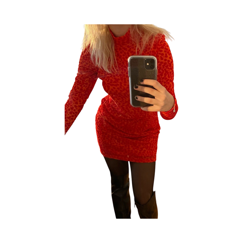 Oranssi-punainen vartalonmyötäinen, joustava meshmekko samettipilkuilla.