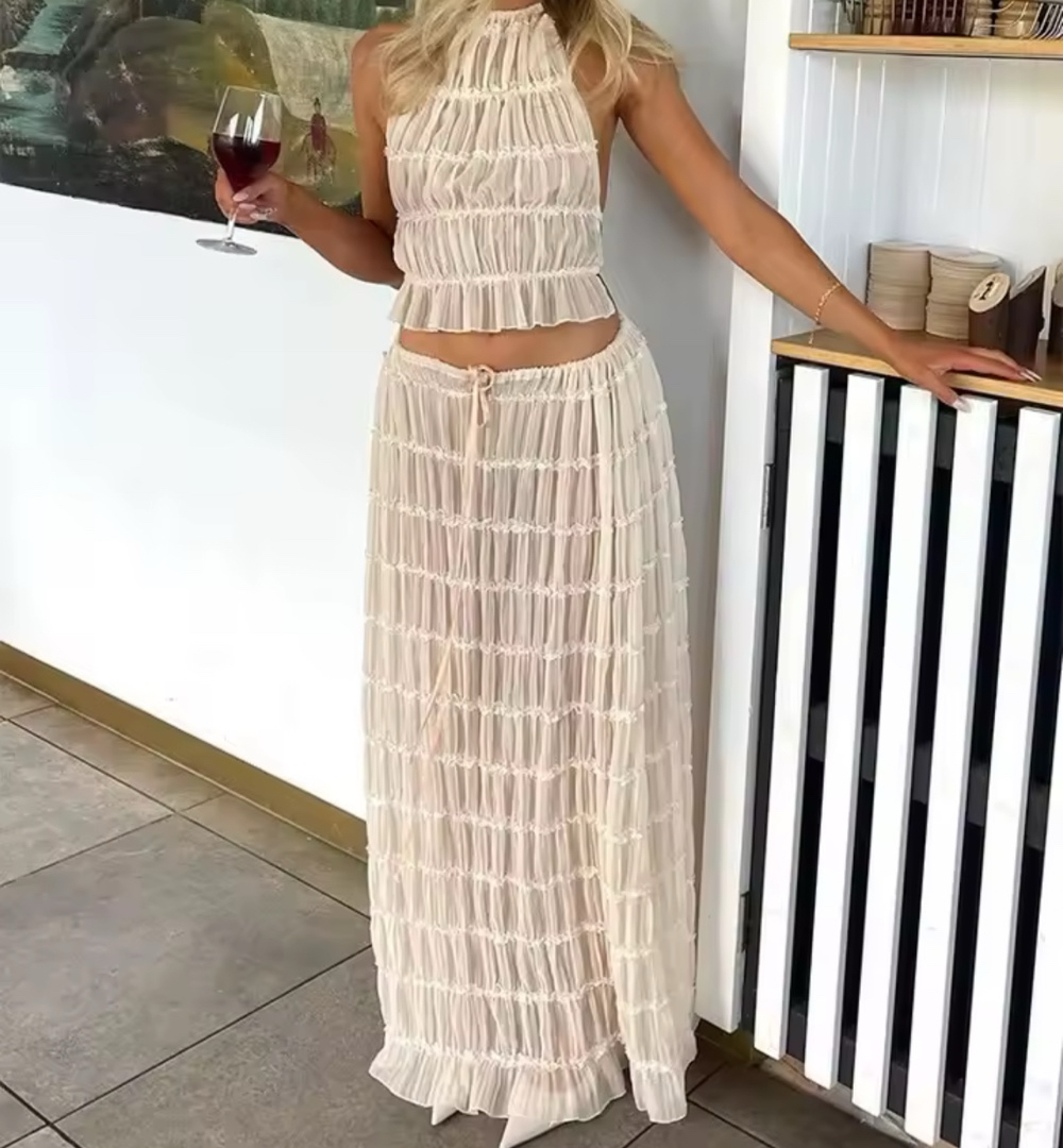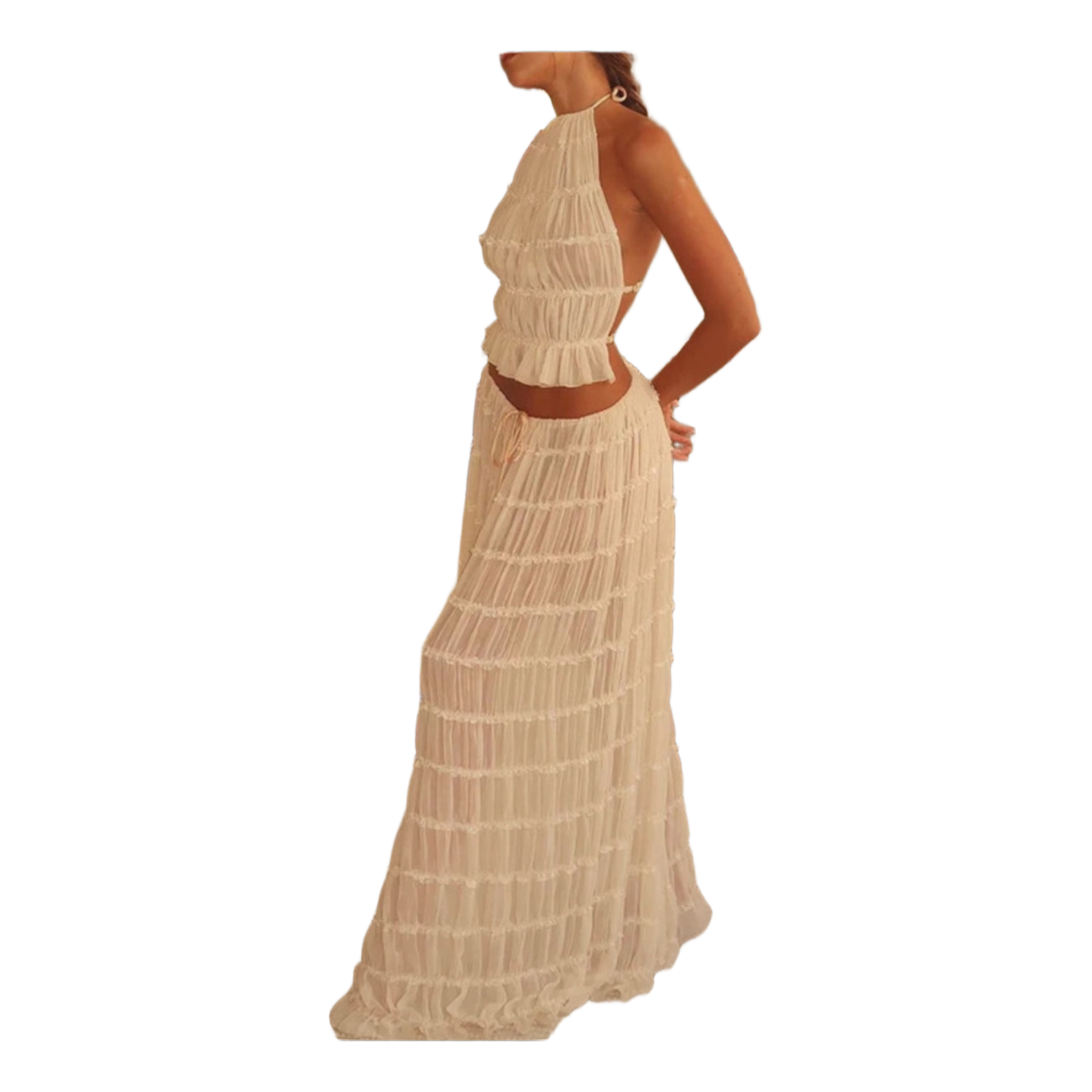 Röyhelöinen kaksiosainen asu, johon kuuluu selästä avoin toppi ja pitkä hame. Vaalea, kevyt ja laskeutuva malli.