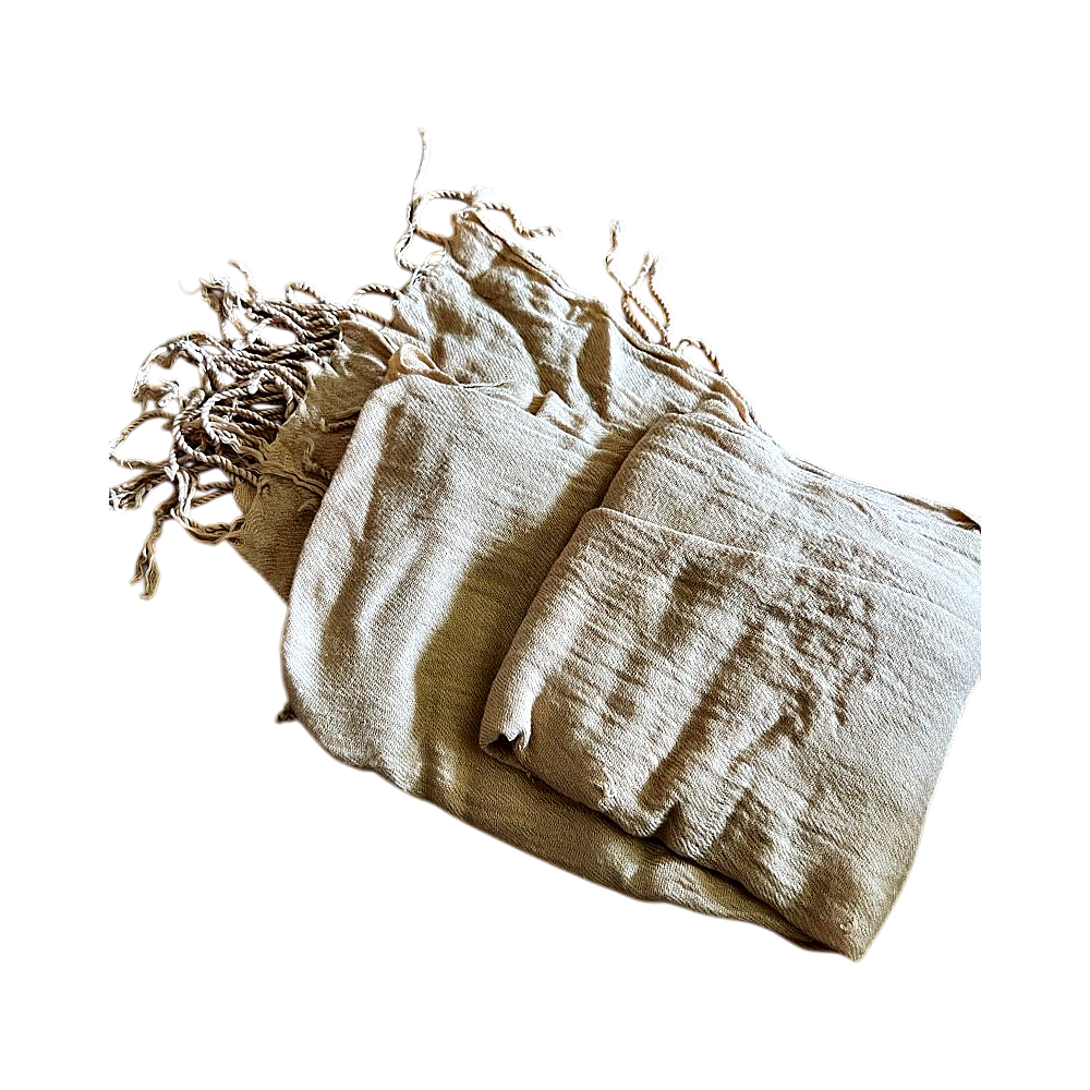 Beige huivi, jossa tupsut reunoissa.