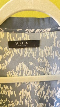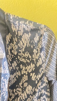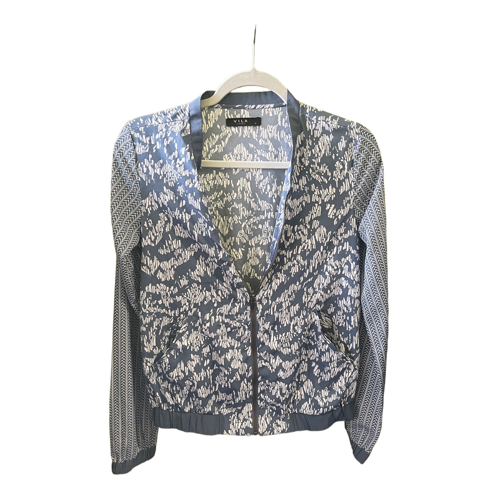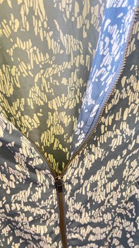 Lightweight bomber jacket with a grey and white pattern. Features a front zip closure, ribbed cuffs, and side pockets. Made of 100% polyester. Size S.