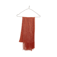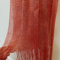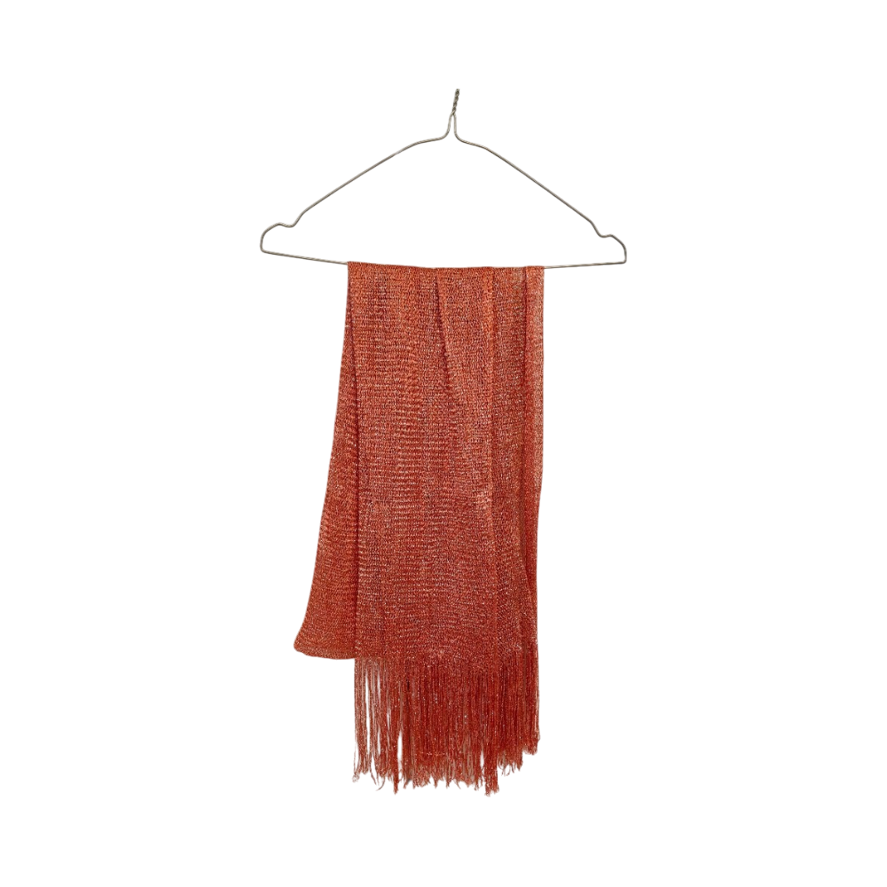 Ohut, kimaltava neulottu huivi hapsureunuksella. Väri lohenpunaisen oranssi/pinkki.
