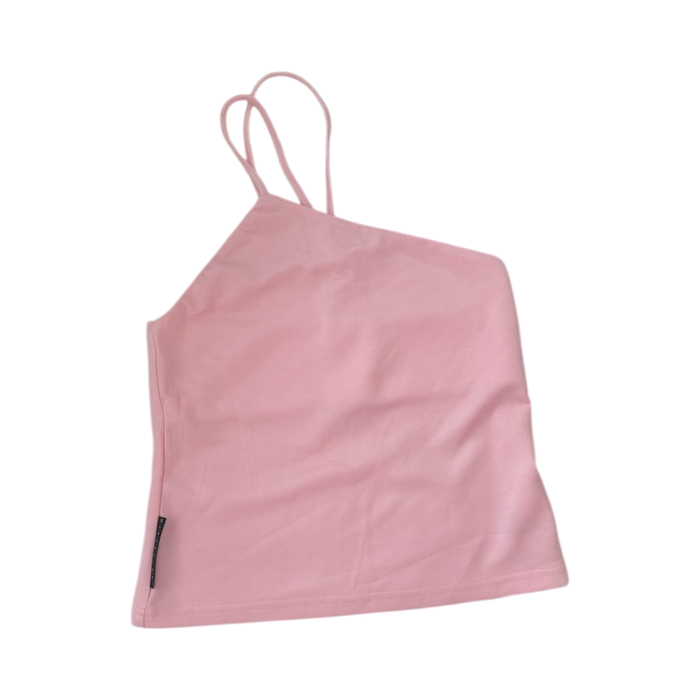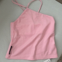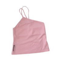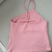 Hihaton vaaleanpunainen toppi ohuilla olkaimilla. Halter neck. Voi pitää myös yhdellä olalla olkaimia