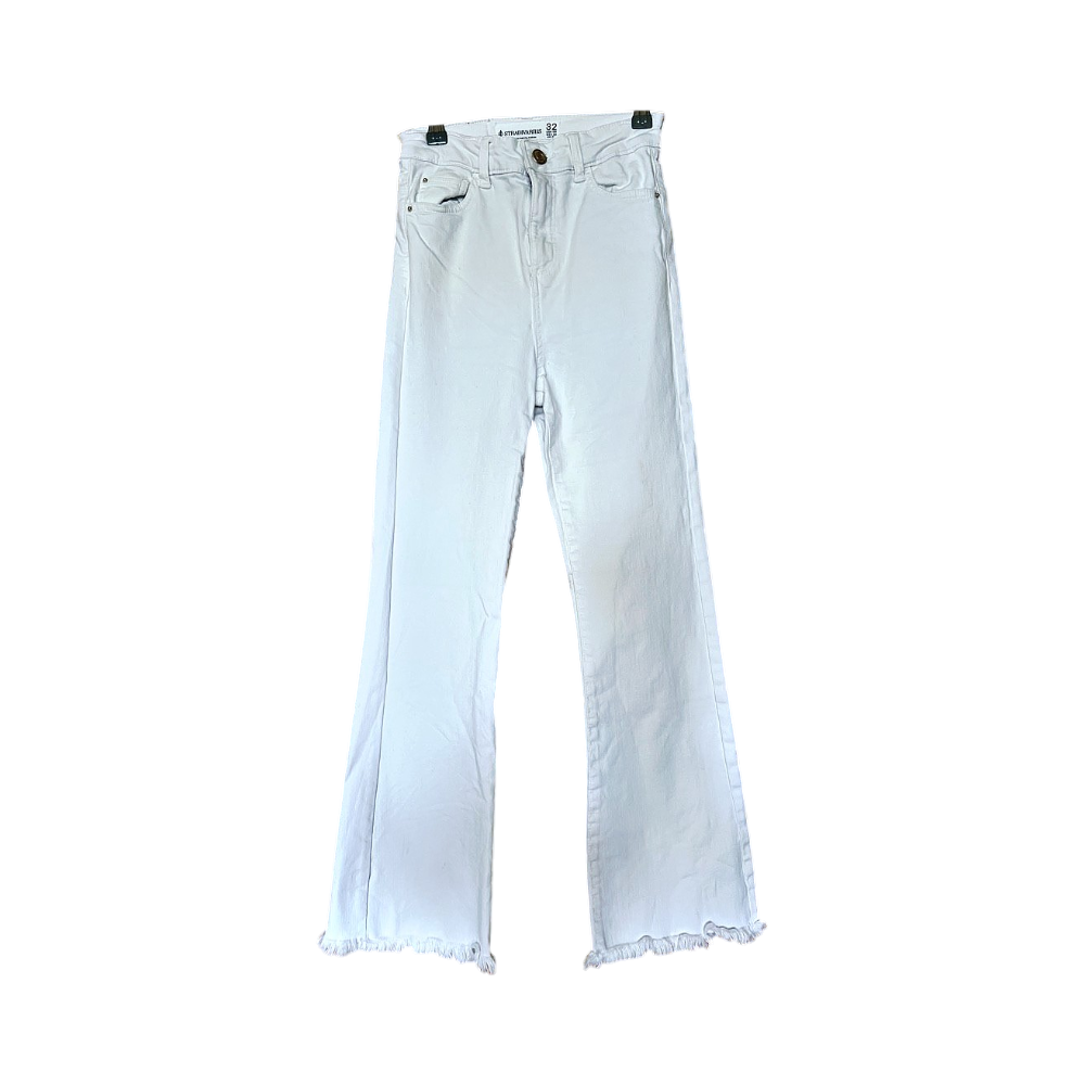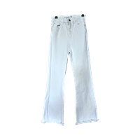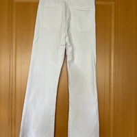 Valkoiset farkut leveillä lahkeilla ja repsottavilla helmillä. Ostettu pari vuotta sitten. Käytetty pari kertaa, uudenveroisessa kunnossa. Nafti koko, suht joustava kangas. Sopii lyhyemmille ihmisille.