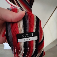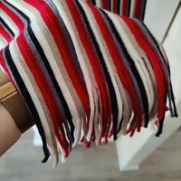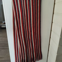 Punavalkoiset raidat, pehmeä hapsureunus. Uudenveroinen. Ei näy käytön jälkiä