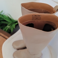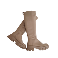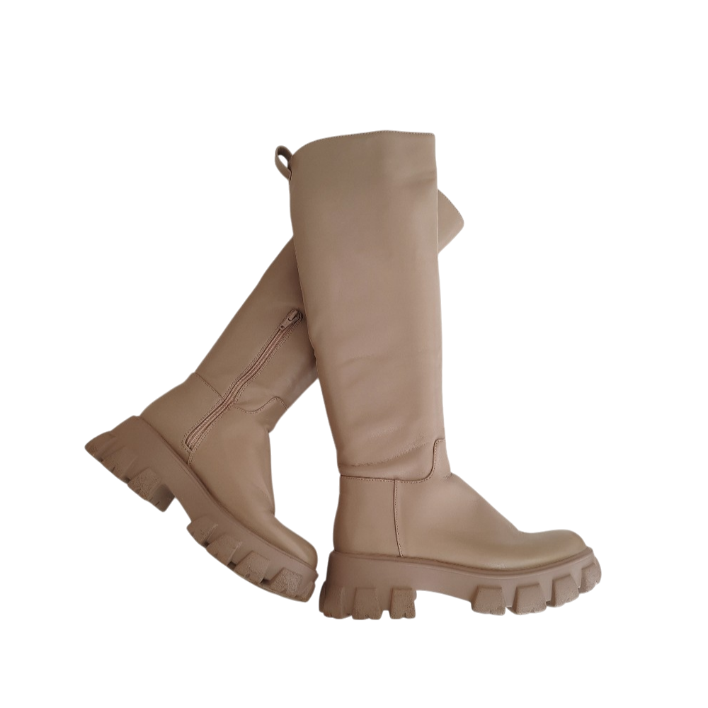 Beigen sävyiset, paksupohjaiset polvikorkeat saappaat.