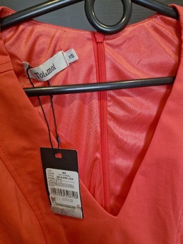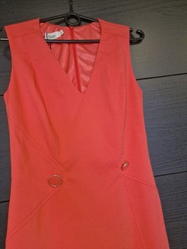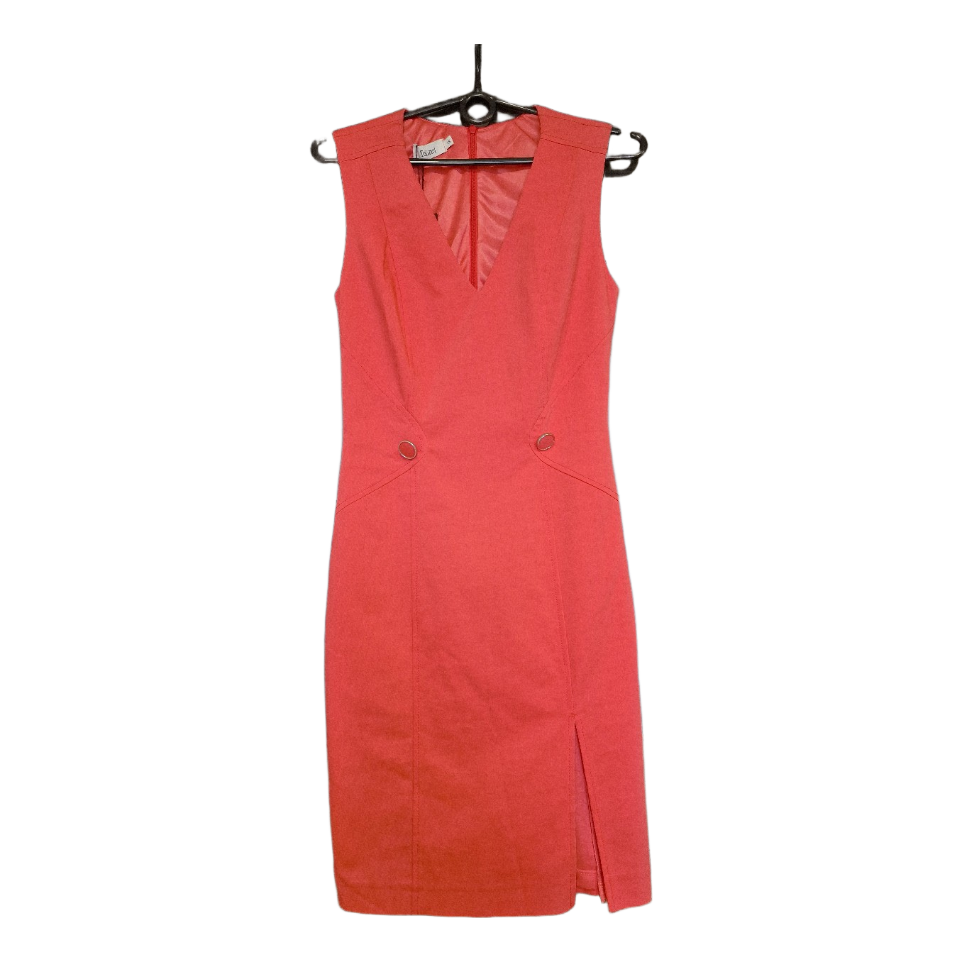 Coral midi dress with a V-neckline and decorative buttons. Features a side slit and a zip closure at the back. Size Xs