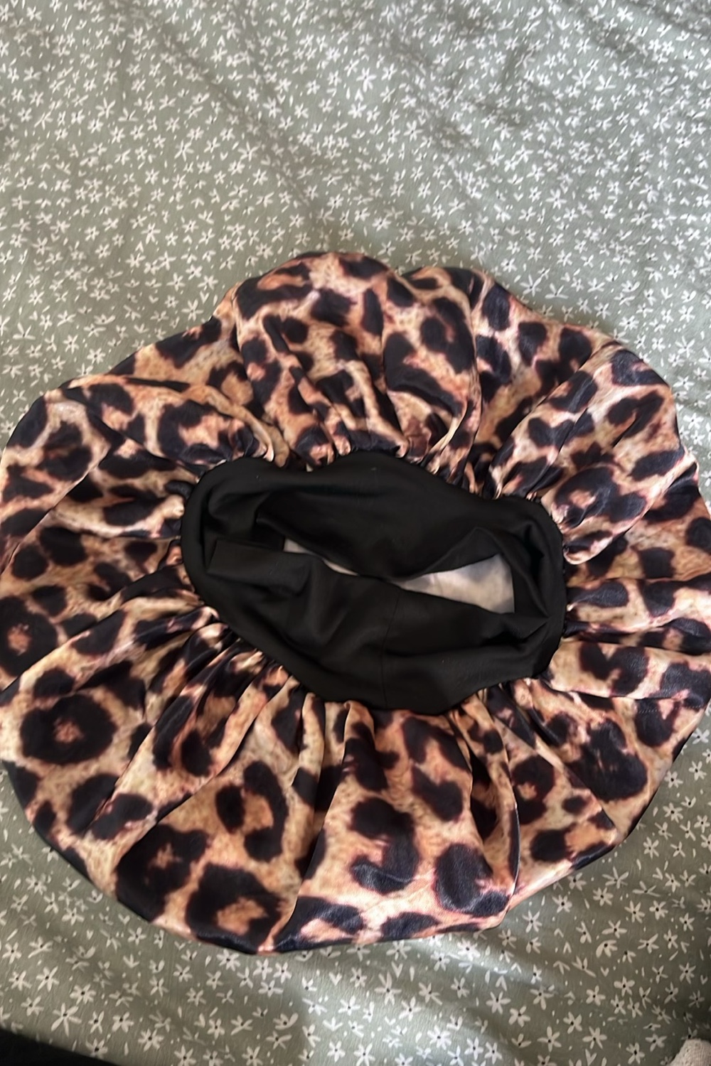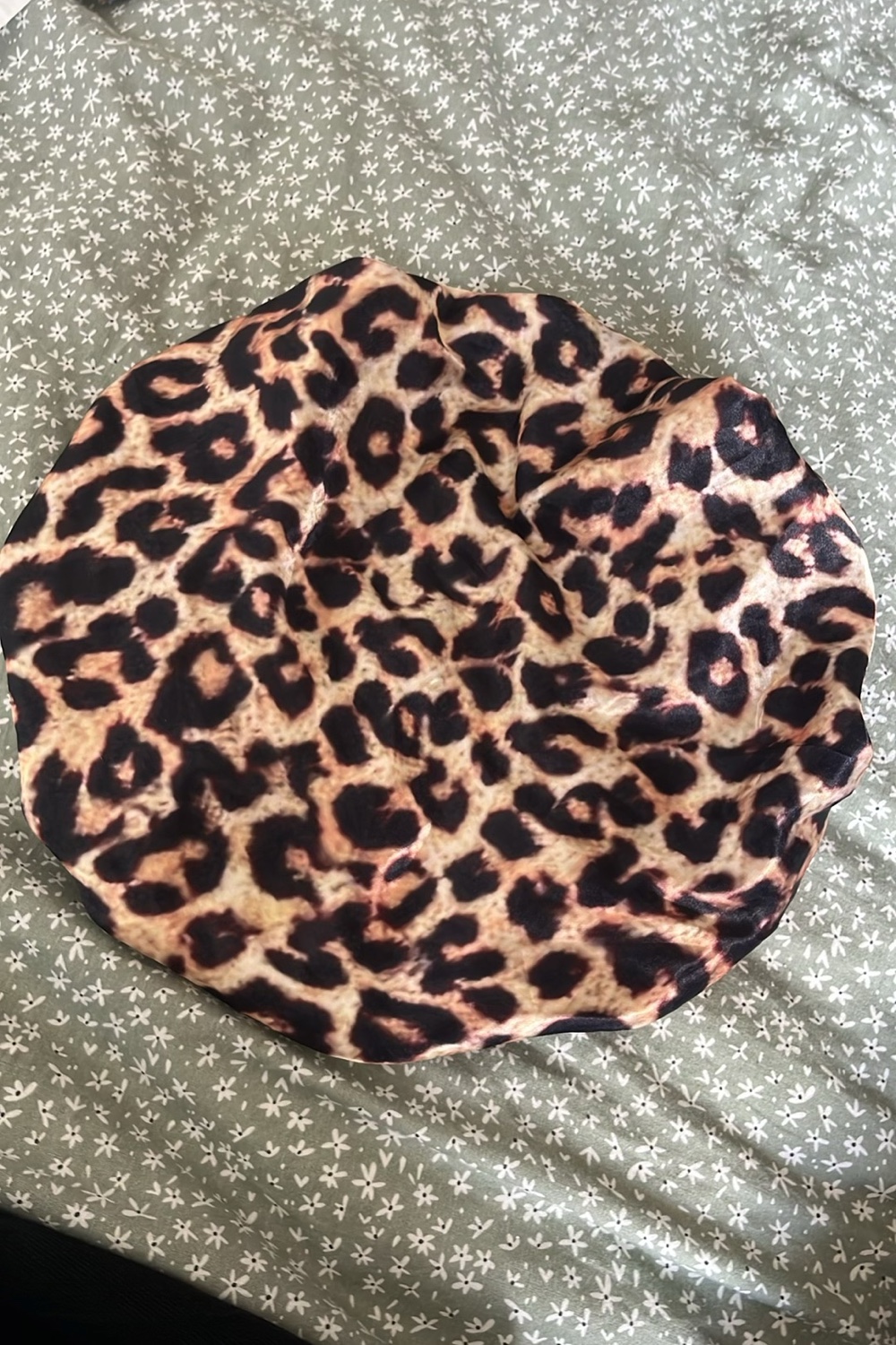 Hair bonnet featuring a leopard print pattern and a solid black elastic band.
