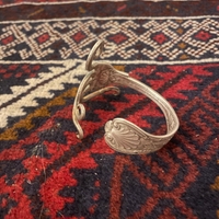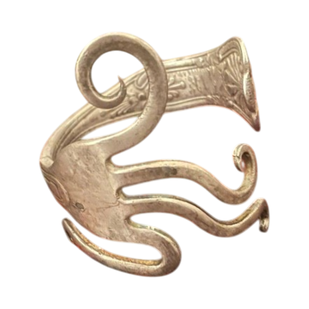 Vintage silver-tone spoon handle cuff, ornate floral engraving.