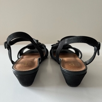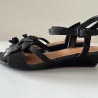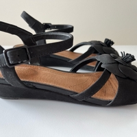Naisten mustat Clarks kiilakorkosandaalit kukkakoristeilla, käytetyt. Sisäpohjan pituus noin 23,5 cm. Kauttaaltaan nahkaa, kumipohjat.