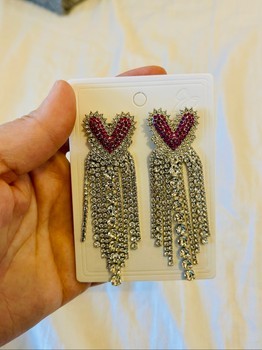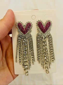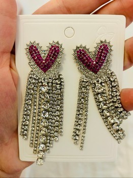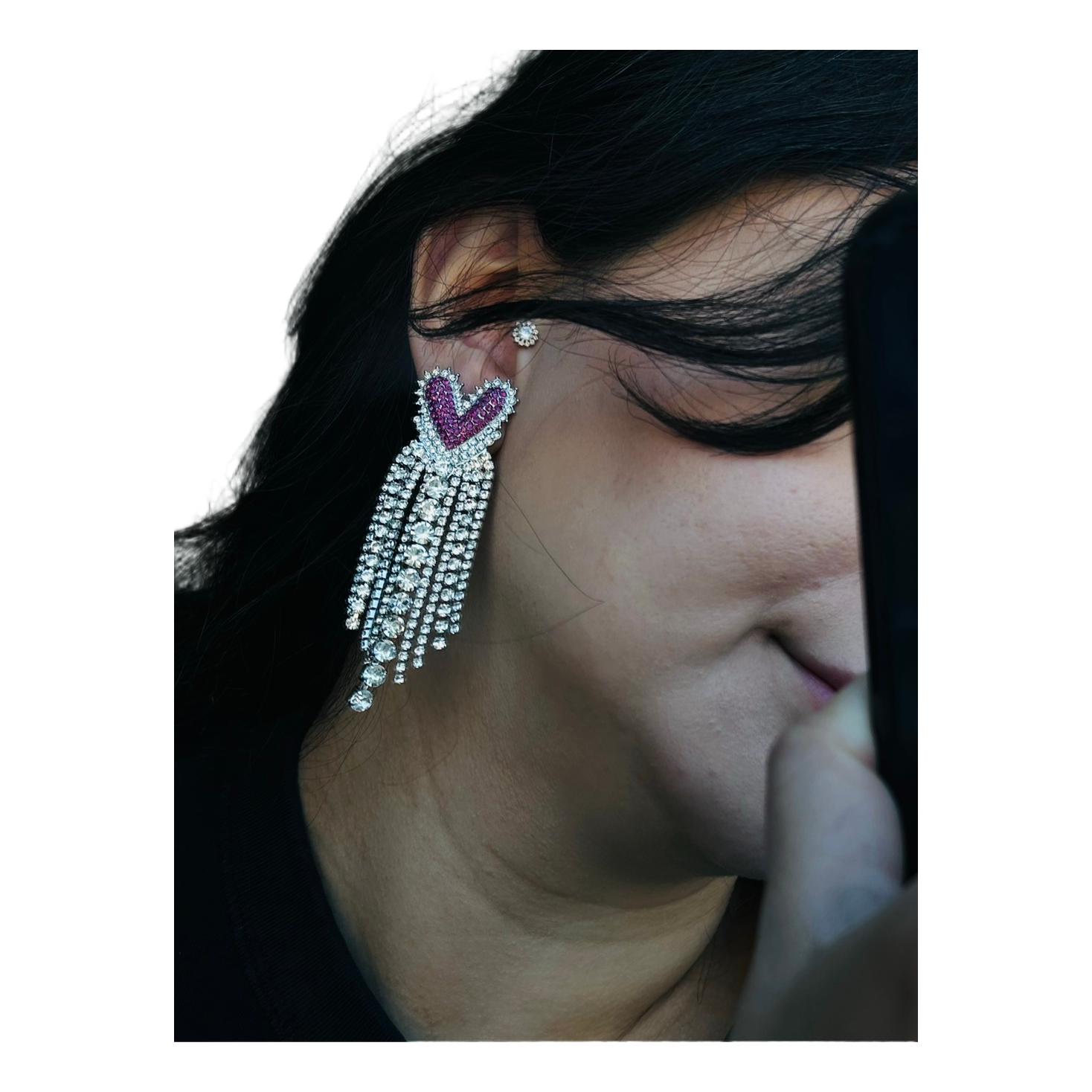 Long crystal tassel earrings featuring a heart-shaped pink stone embellishment. Silver-tone setting.