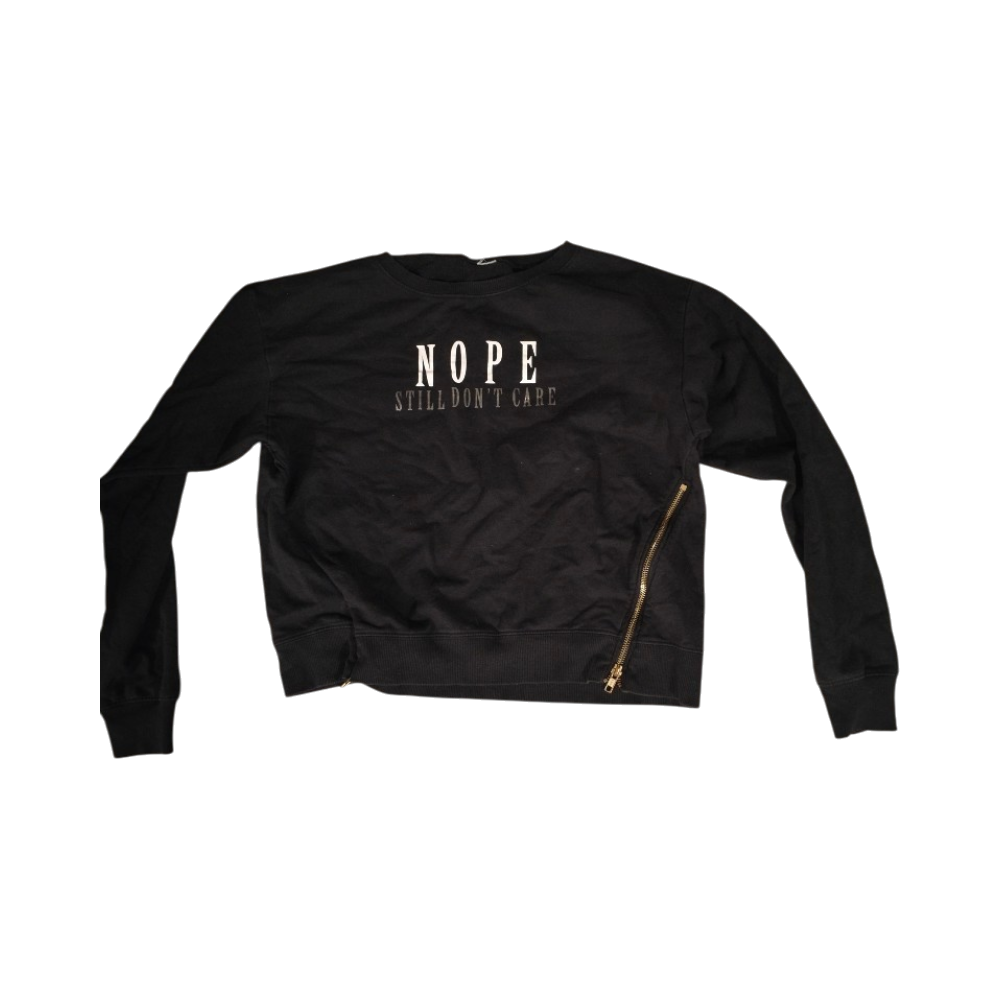Mustaa collegepuseroa, teksti 'NOPE Still don't care', vetoketju.