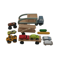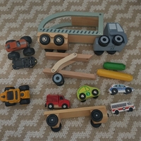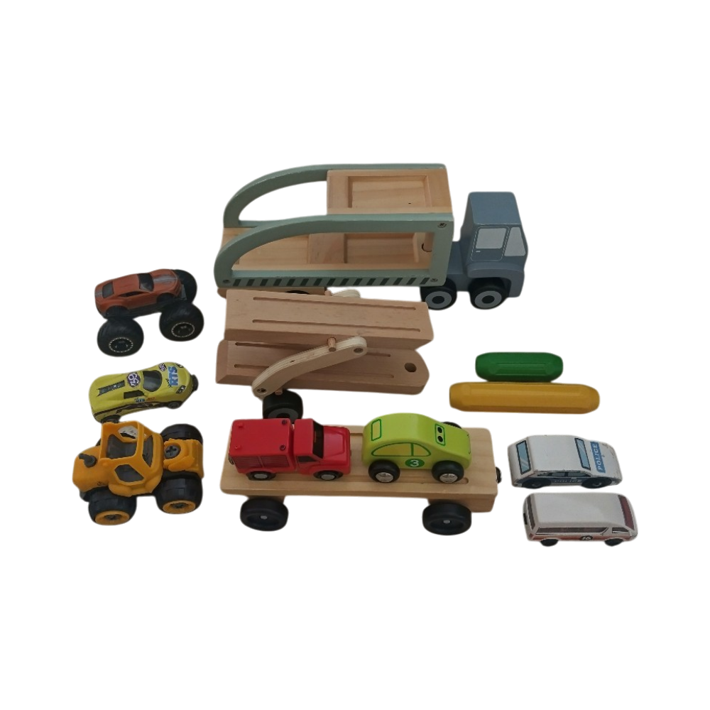 Sekoitus puisia ja pieniä muovisia leikkiautoja ja traileri.
