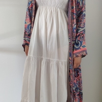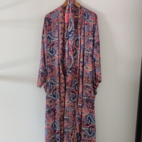 Värikäs kuviollinen silkkisen tuntuinen kimono vyöllä, kevyt ja ilmava. Sopii mainiosti eri asukokonaisuuksiin tai vaikka mukavaksi aamutakiksi. Ovh. 90€, käytetty vain n. 3 kertaa.