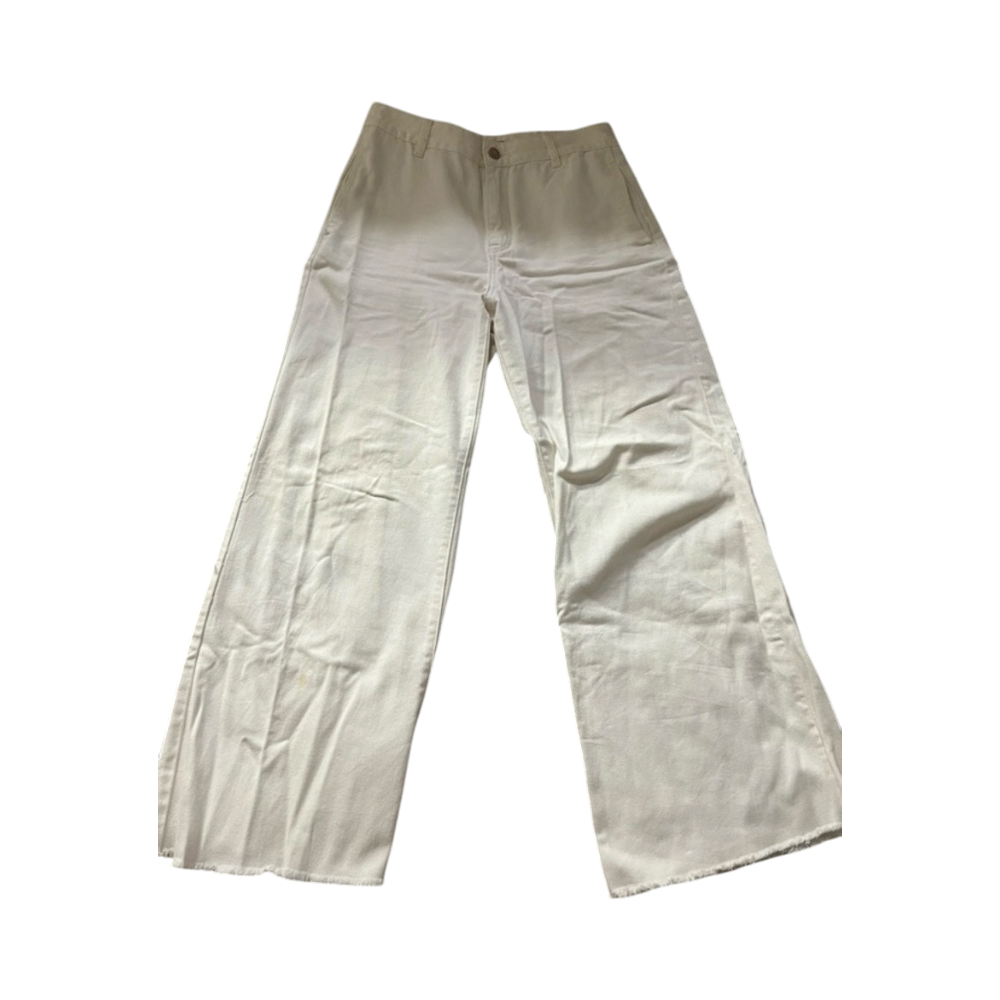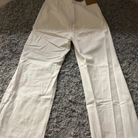 Valkoiset leveälahkeiset farkut, koossa 30, vastaa noin M kokoa. Lahkeita on itse lyhennetty. Parista kohtaa farkuista löytyy pienet kellertymät, jotka näkyvät kuvissa ja vyötärön kohdalla myös pientä haalistumaa, joka ei kuitenkaan näy käytettäessä.
