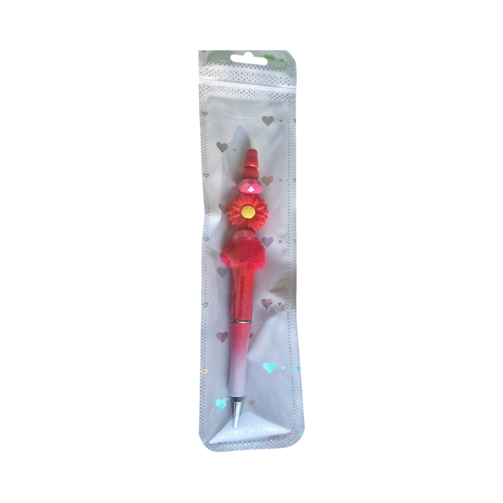 Koristeellinen, glitterinen kynä pom-pom- ja helmikoristeilla.