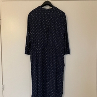 Tummansininen trikoomekko, jossa valkoisia kuvioita. Taskut ja vyötäröllä naru.