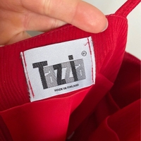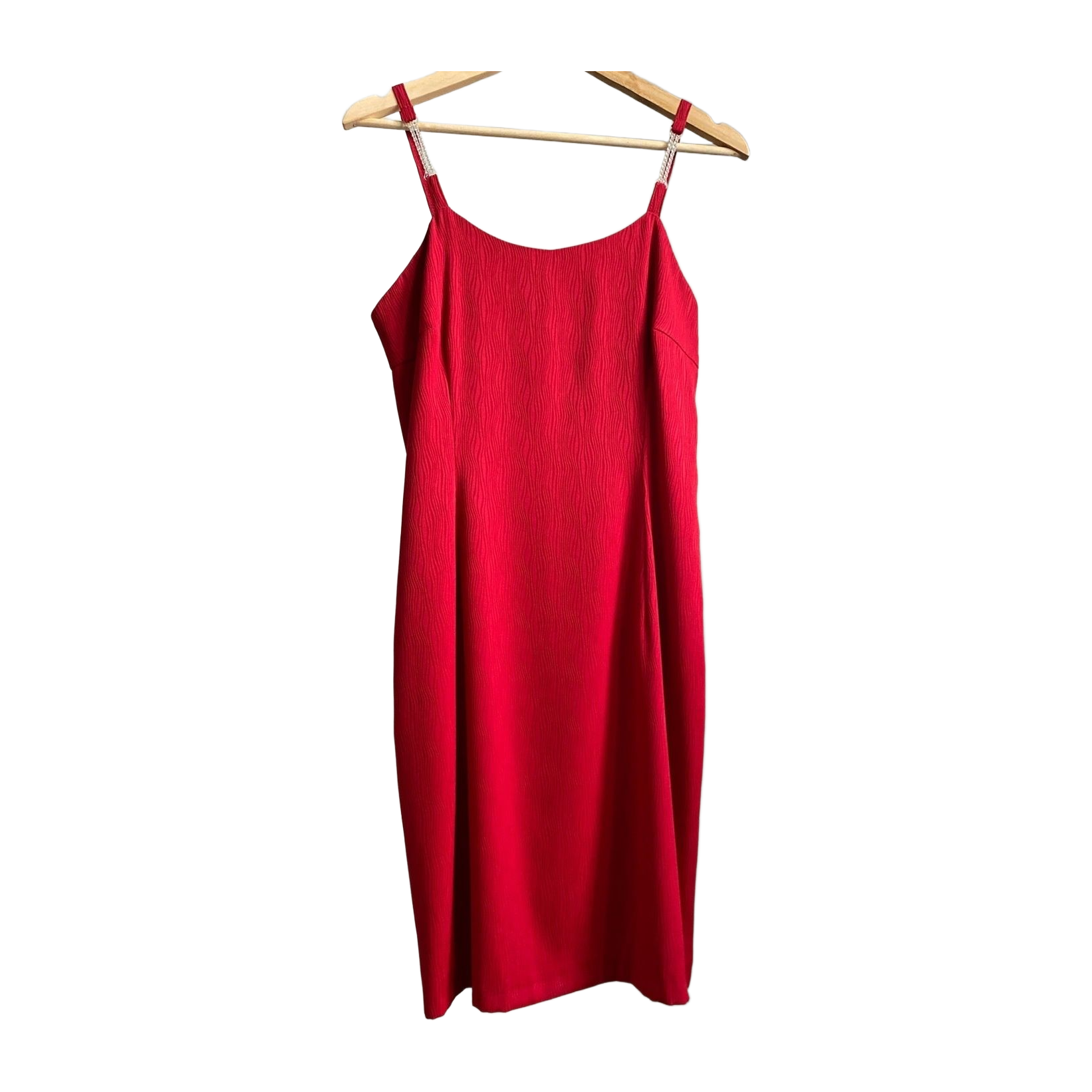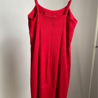 Kaunis punainen mekko. Joustavaa materiaalia. Polveen asti ulottuva. Takana noin 15cm pituinen halkio. Made in Finland.