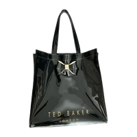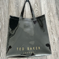 Kiiltävä Ted Baker laukku, isompi versio. Noin 37cm/37cm korkeus ja leveys. Valoa vasten näkee jotakin hiusnaarmua pinnassa, kuten kuvissa näkyy. Muuten kantokahvat ja yleisilme siisti. Sisällä oleva vetoketjutasku on rikki, ei haittaa käyttöä, eikä näy ulos. Ilmainen toimitus ekaa kertaa tilatessa, koodilla: JH1560.