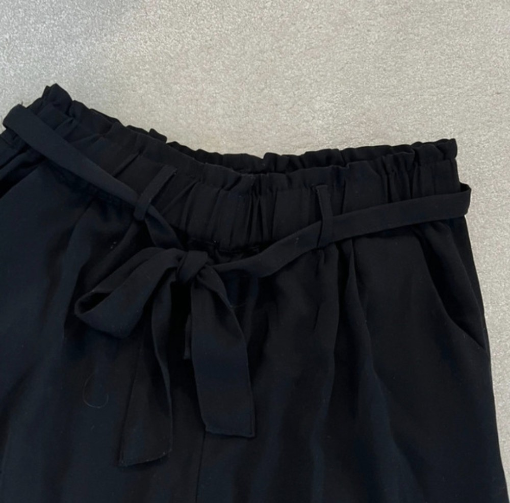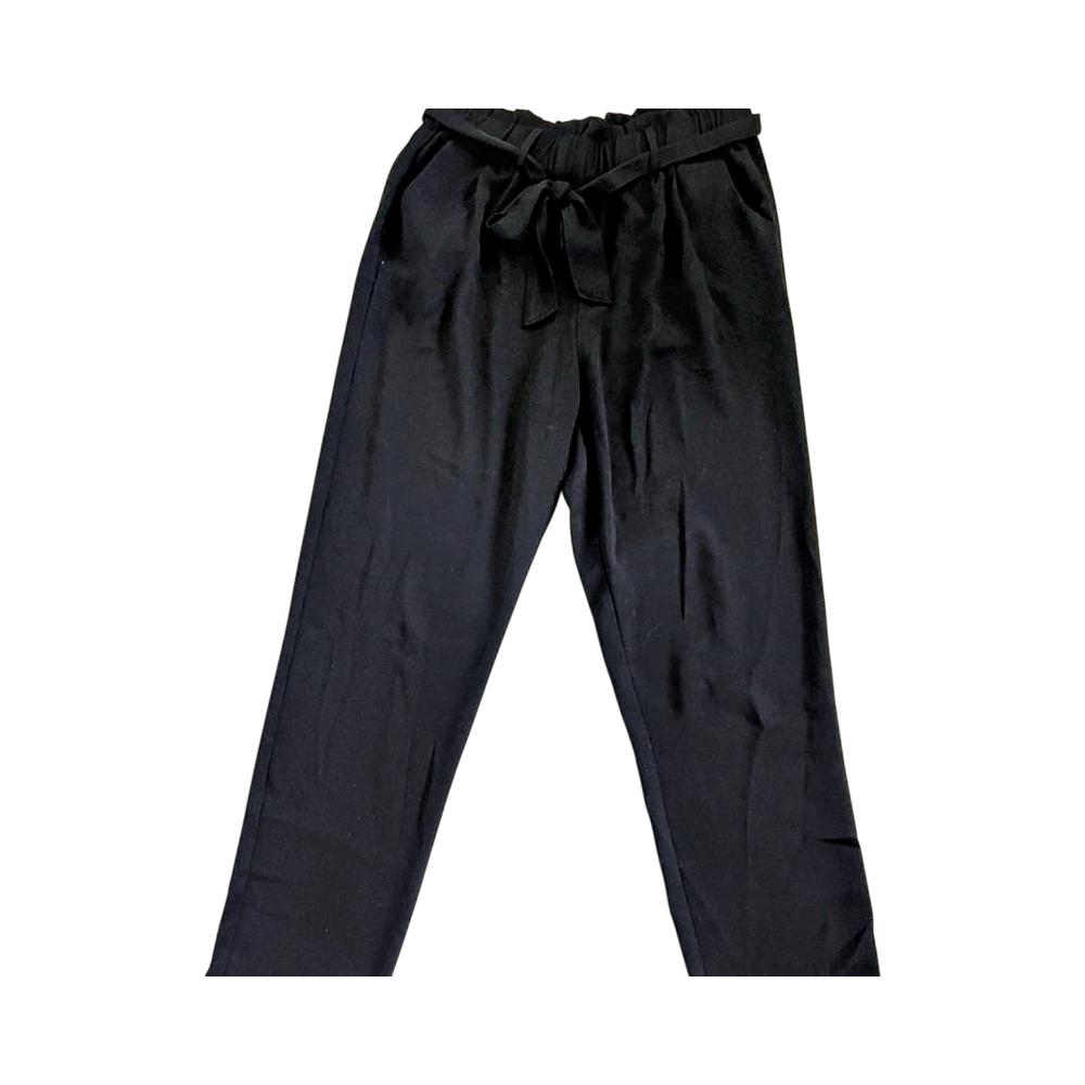 Mustat kangas housut vyöllä. Hieman kapenevat lahkeet, joustava vyötärö.