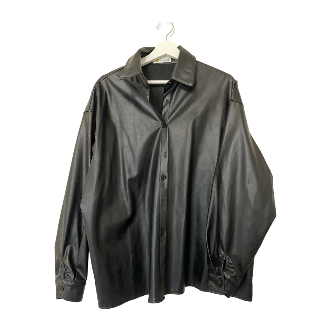 Naisten musta keinonahkainen pitkähihainen kauluspaita. Kaikki napit kyllä tallessa, kuvassa napitettu vain joka toinen. Väljä
