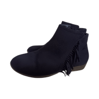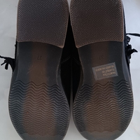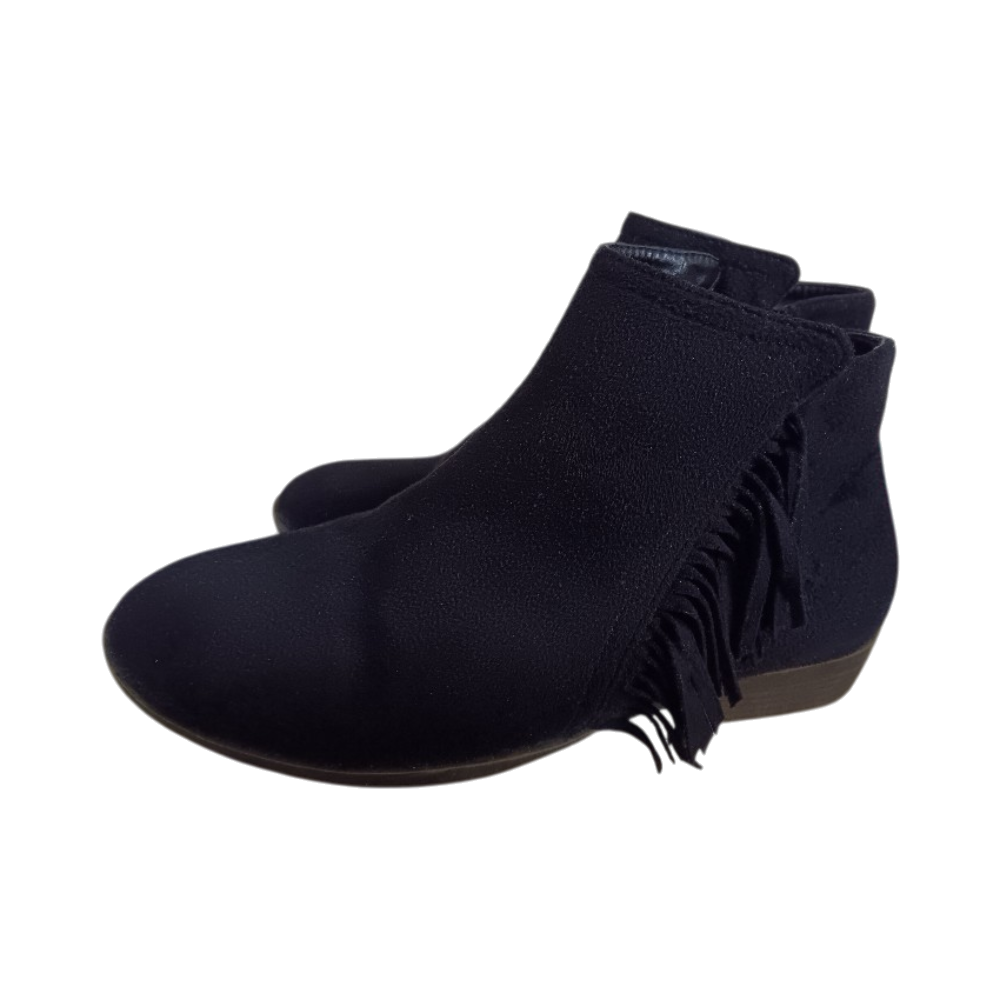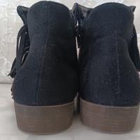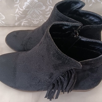 Lyhyet mustat nilkkurit hapsuilla, matala korko. Mokkajäljitelmä. Vetoketjukiinnitys.