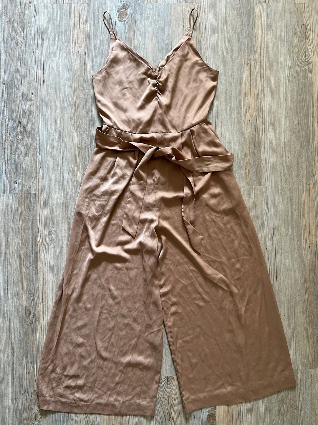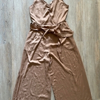 Tummanbeige silkkinen jumpsuit puolipitkillä punteilla. Takana vetoketju, sivuissa taskut. Koko 38