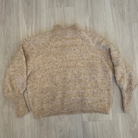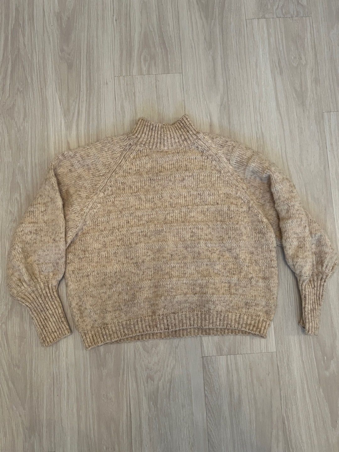 Beige pehmeä neule pallohihoilla. Toisen hihan resorissa pieni ”purkauma” (näkyy viimeisessä kuvassa).
