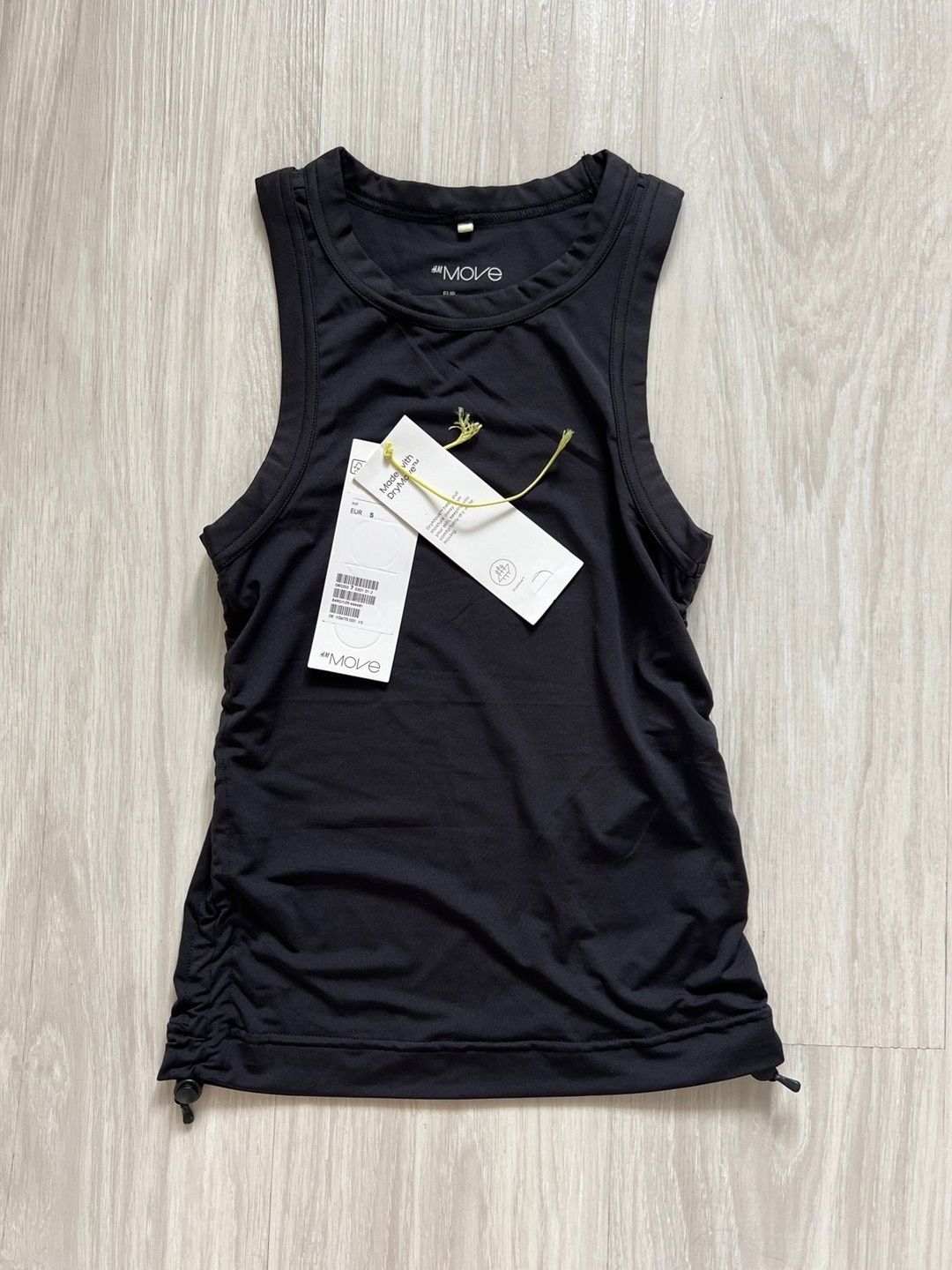 Musta treenitoppi ohutta hengittävää kangasta. Sivuissa kiristysnauhat. Toppi on käyttämätön, mutta lappu leikattu irti.