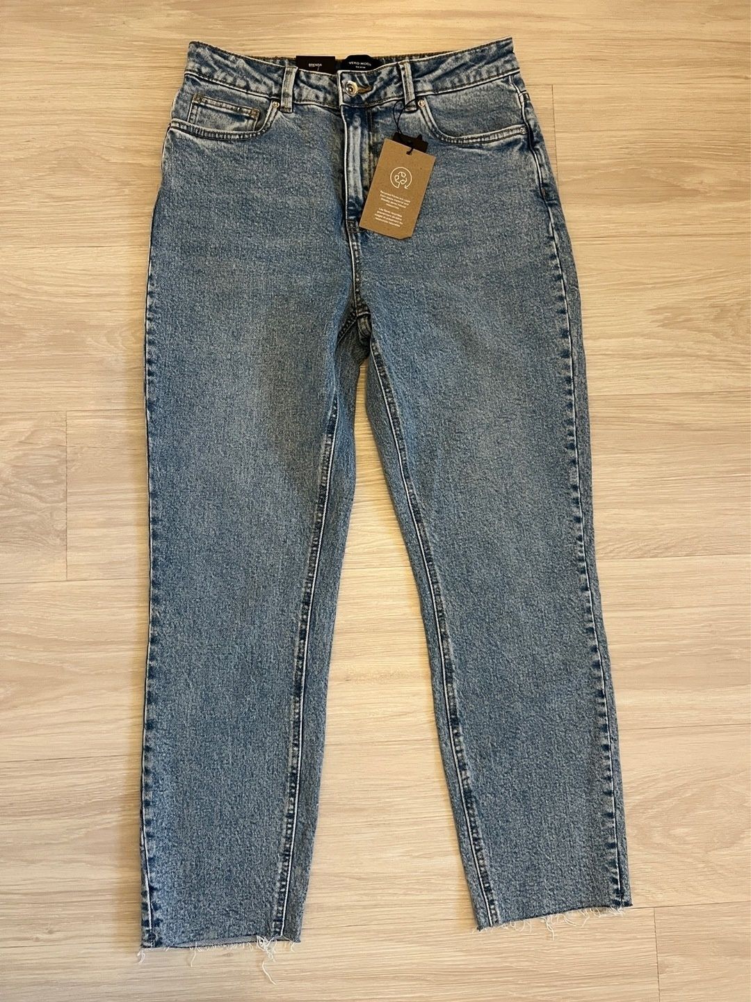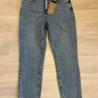 Siniset farkut korkealla vyötäröllä. Suorat puntit.