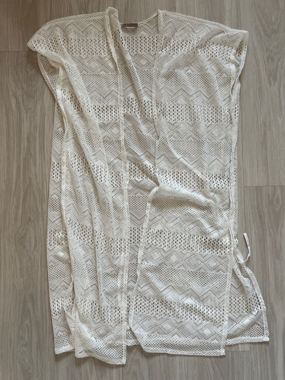 Läpikuultava valkoinen lyhythihainen rantakimono.