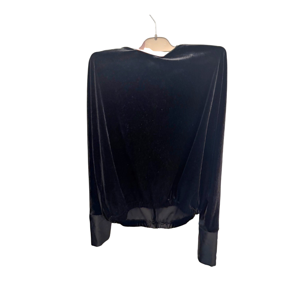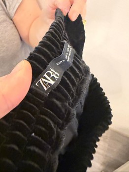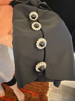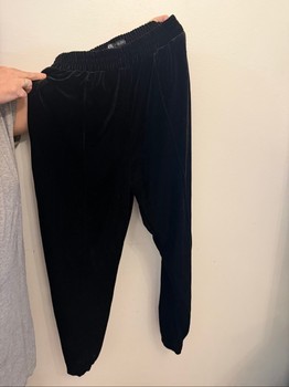 Black velvet trousers with an elasticated waistband. Features decorative buttons on the cuffs. Size L.