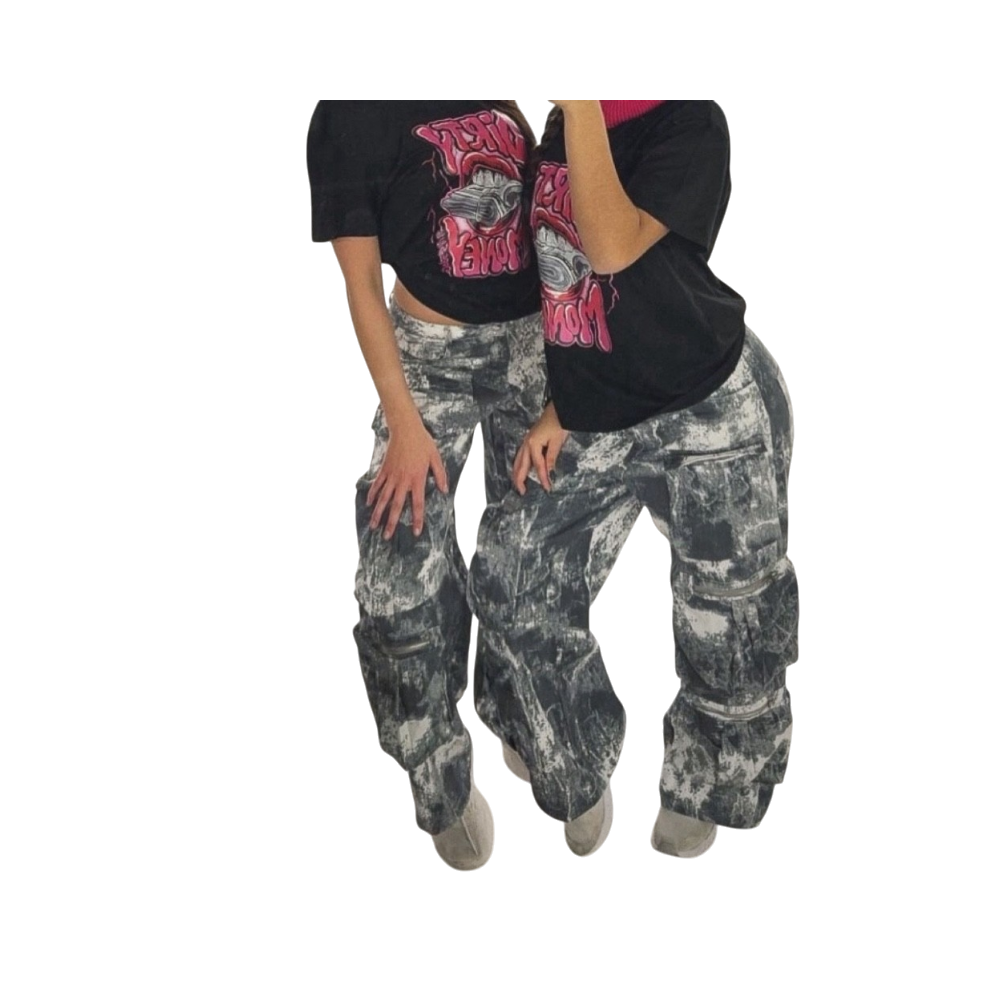Leveät, taskulliset cargo-housut marmoroidulla kuosilla. Pari kertaa käytetty