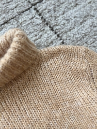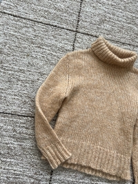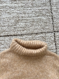 Beige neulepusero poolokauluksella, lämmin ja pehmeä materiaali.