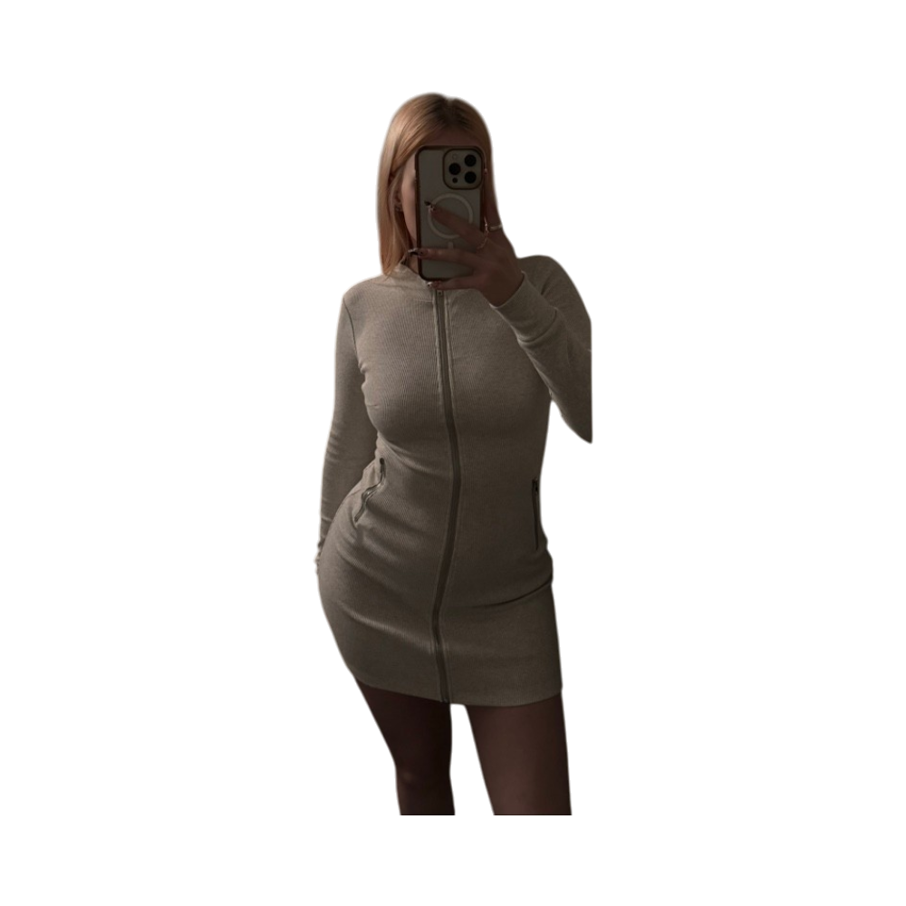 Tiivis ribbimekko, vetoketju edessä, pitkät hihat. Hyvin menee myös s-m kokoiselle