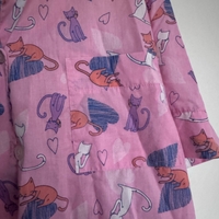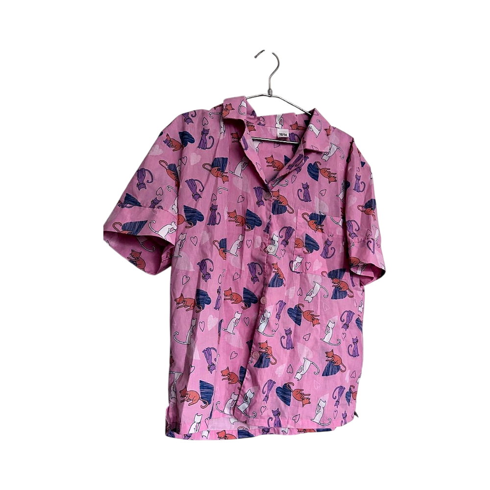 Kissakuvioinen kauluspaita yhdellä taskulla, napit eivät mene ylös asti. Hieman laatikkomallinen, suht ohutta kangasta, mutta ei läpinäkyvä. Väittää olevan L/XL kokoa, mutta enemmänkin M.