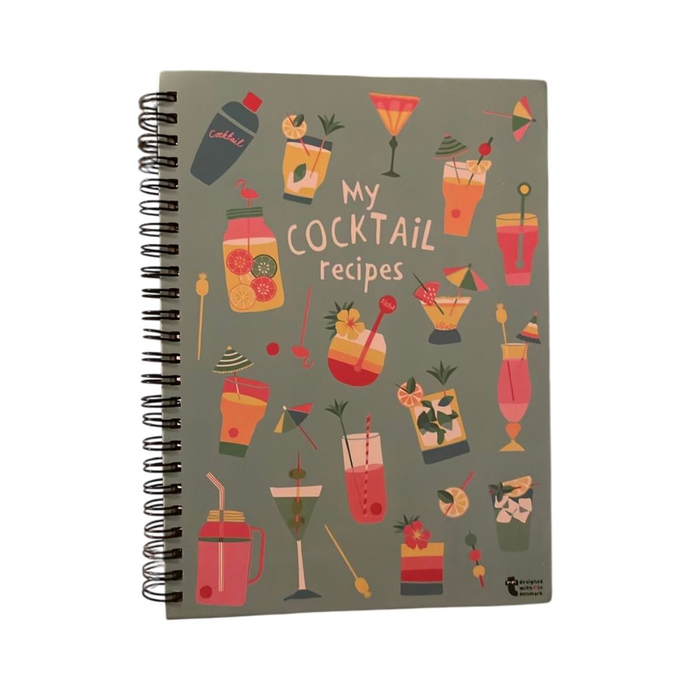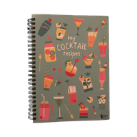Spiral-bound cocktail-reseptivihko, täytettäviä sivuja.