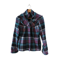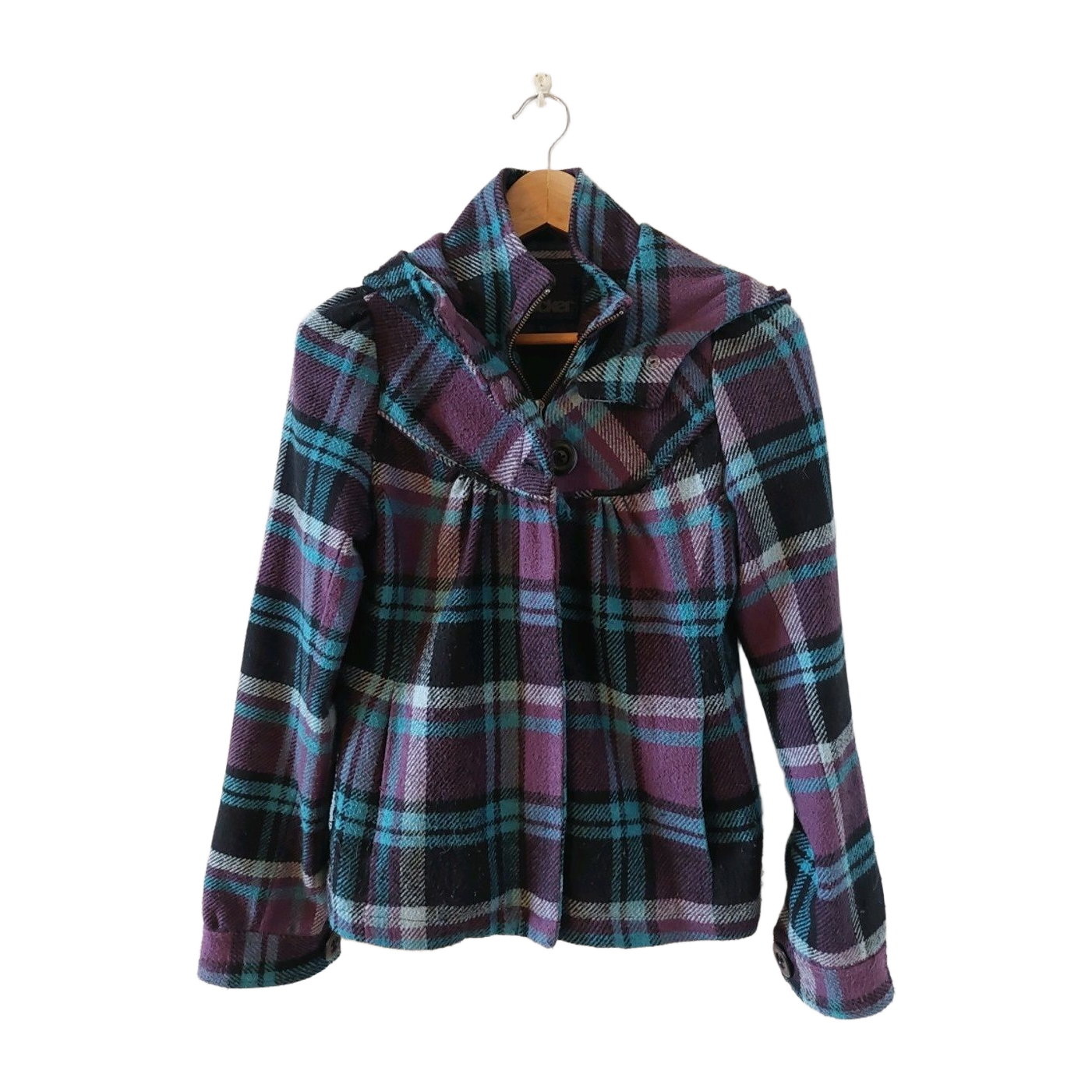 Lyhyt, hupullinen, ruutukuvioinen takki polyesteri-villasekoitekankaalla.