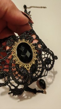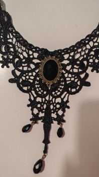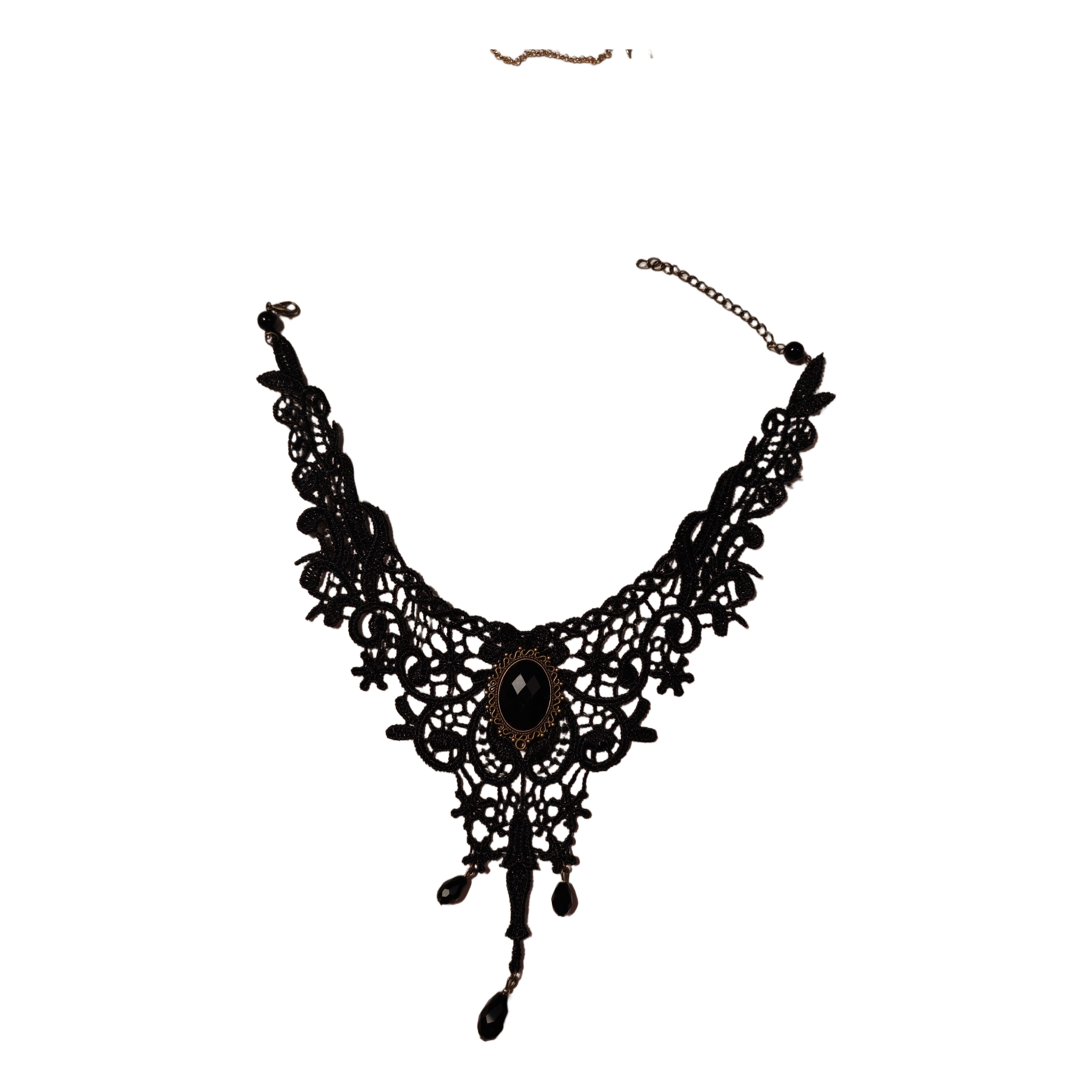Musta pitsikoristeinen kaulakoru, jossa on tumma kivi ja roikkuvat koristeet. Gootti