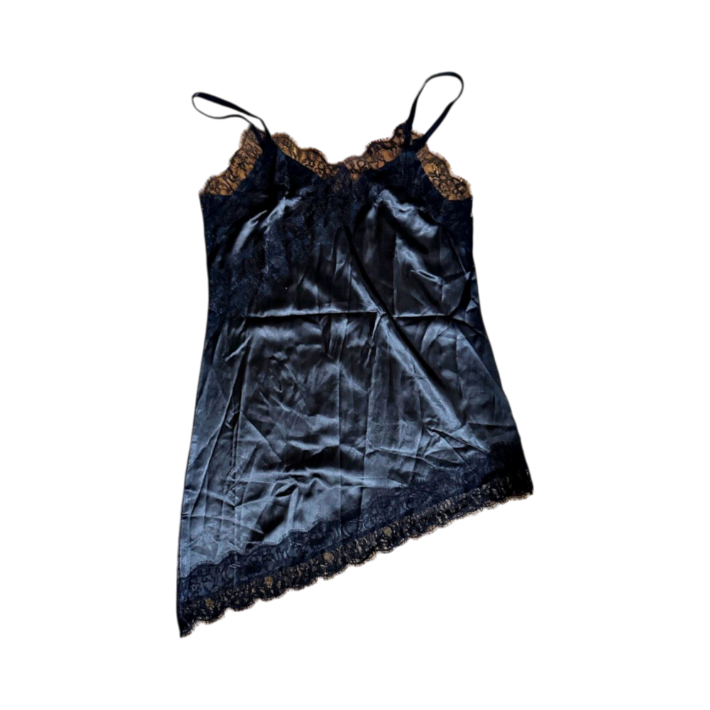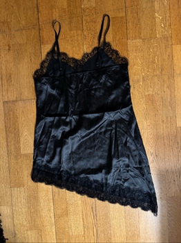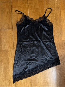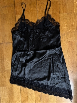 Musta satiinipintainen toppi, jossa on kapeat, säädettävät olkaimet. Kaula-aukossa ja helmassa on pitsiyksityiskohtia. Minimekko
